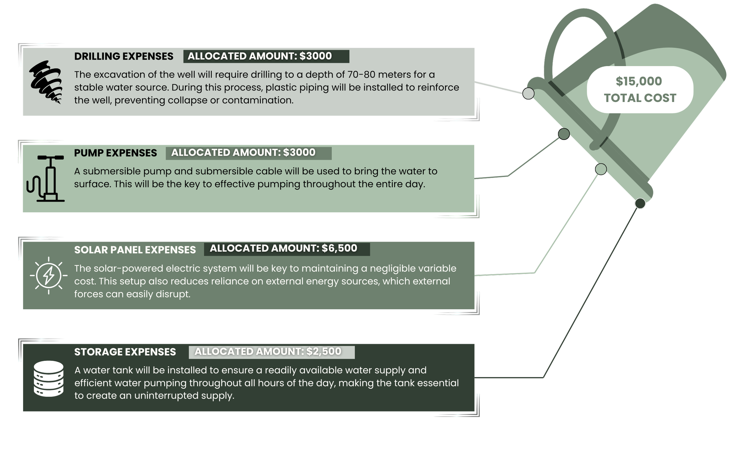 Our team will fundraise to cover the full investment cost to ensure the drilling, pumping, solar panel, and storage costs are taken care of.